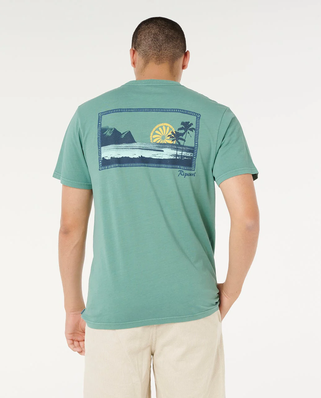 Relaxed and pigment dyed, the Mod Cali Sunset Tee is a soft cotton jersey tee featuring front and back prints that embody golden hour vibes on the coast.