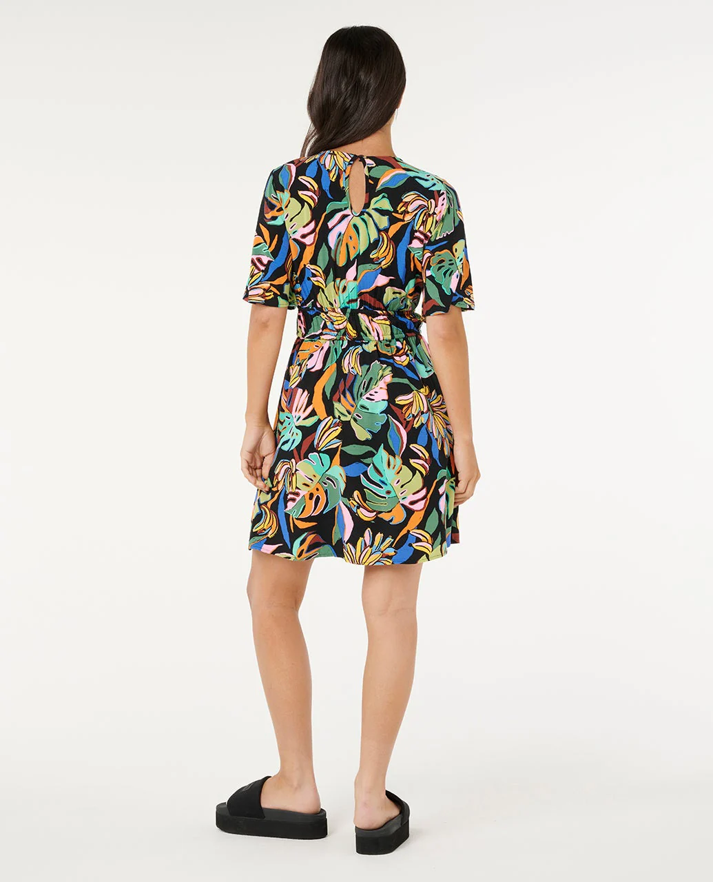 Lightweight woven fabric meets all-over yardage print in the Sunset Luau Short Sleeve Mini Dress. Designed with short sleeves, a flattering elastic waistband, and a softener wash for comfort, it’s finished with a metal logo trim for a subtle surf-inspired finish.